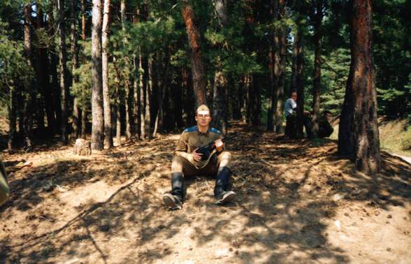 Денис с автоматом. На тойже самой точке (если вы подумали что на пятой - см предыдущие фотографии) Нарядился. Одел сапоги, подтянулся, сапоги протер. Вот только обо что ??? Не помню.
